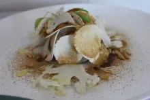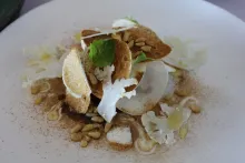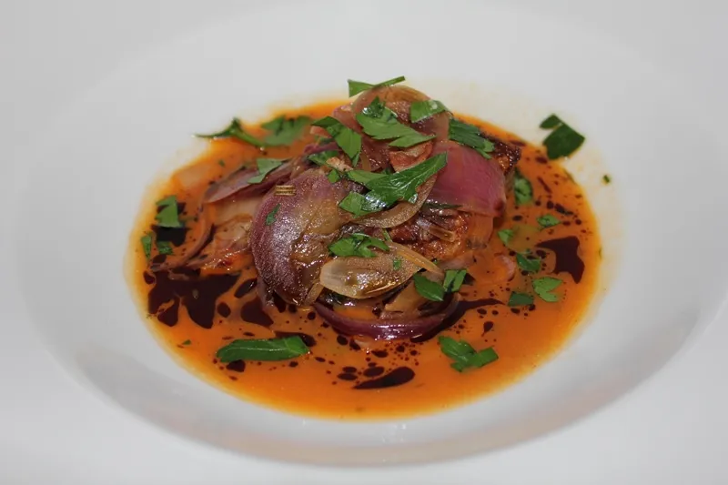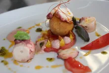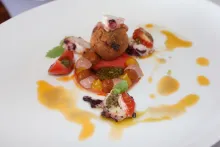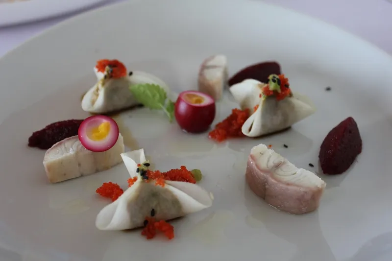 Údený úhor s kačacou pečeňou foie gras a prepeličím vajíčkom marinovaným v červenej repe