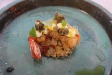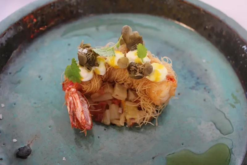 Smažené krevety v kadaif rezancoch s yuzu a paprikovou salsou