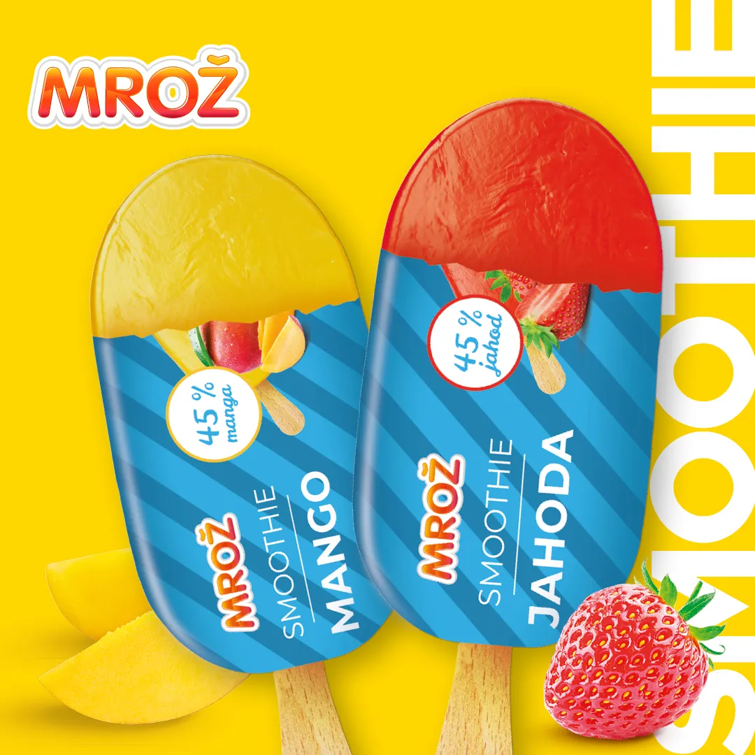 Mrazivo dobré a vysoko kvalitné novinky Mrož smoothie skvele osviežia počas horúcich letných dní. Jemná jahodová a mangová zmrzlina majú jedinečný 45 % podiel ovocia.